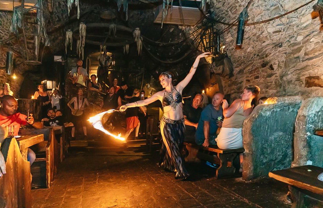 Maravilloso entretenimiento medieval: Disfruta de las actuaciones de juglares, malabaristas, espadachines y tragafuegos de gran talento, que recrean el animado ambiente de las juergas medievales.