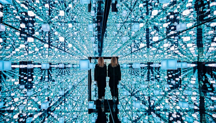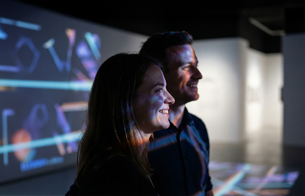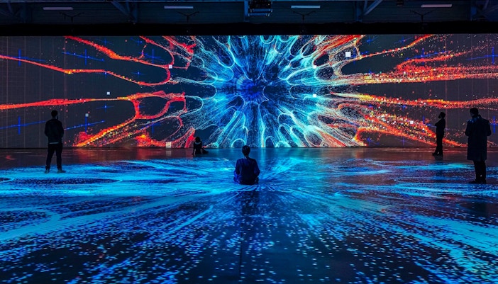 Spaceruj po dużych pokojach, w których ruchome oświetlenie, abstrakcyjne wizualizacje i zsynchronizowany dźwięk owijają się wokół murów i podłóg, zamieniając sztukę cyfrową w pełni przestrzenną wycieczkę.
