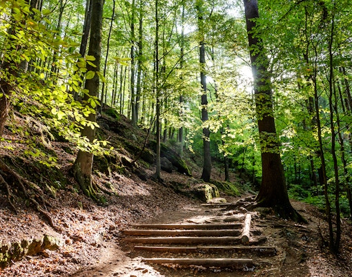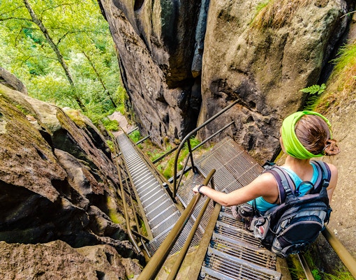 This popular route begins at the Bastei viewpoint and descends through forested paths and stone steps toward the Elbe River, ending in the village of Rathen, with continuous cliffside views along the way.