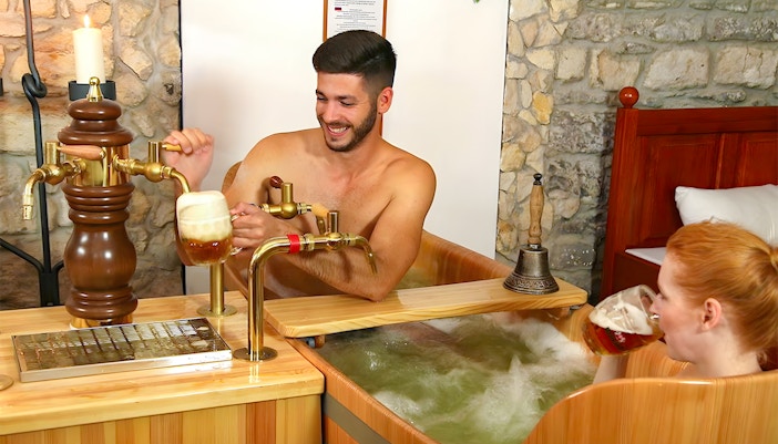 Sjunk ner i en träbalja fylld med varm ölblandning och smutta på obegränsat med Bernard-öl på kran. Efter badet kan du koppla av i en uppvärmd säng och få en flaska Bernard-öl med dig hem.