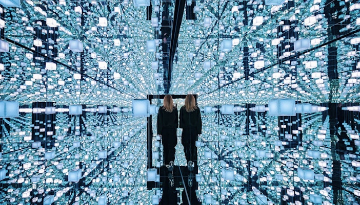 Hareketli ışığın, soyut görsellerin ve senkronize sesin duvarları ve zemini sararak dijital sanatı tamamen mekânsal bir deneyime dönüştürdüğü büyük ölçekli odalarda yürüyün.